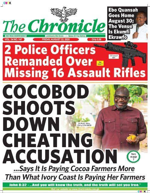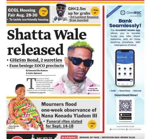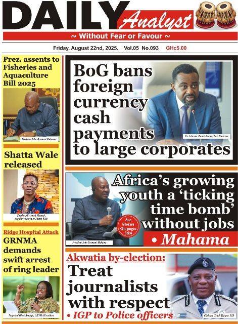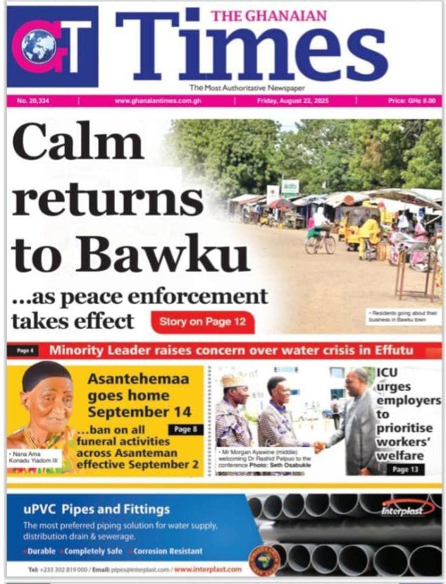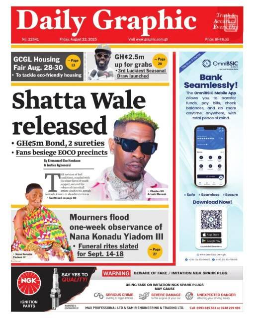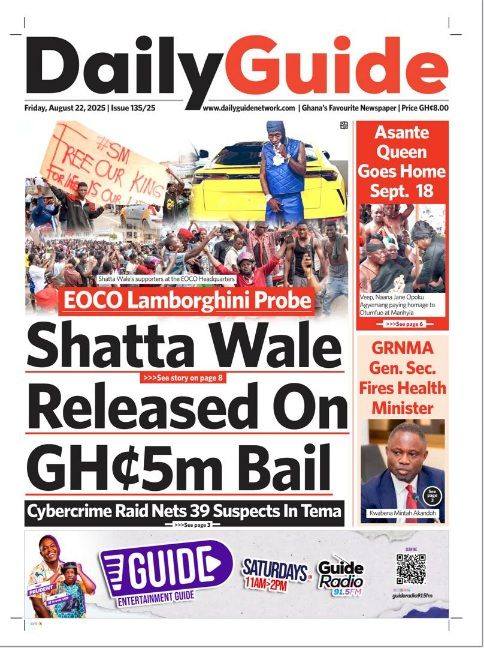 Home/General News/Friday August 22 2025 Newspaper Headlines General News Friday August 22 2025 Newspaper Headlines Eddie KesseAugust 22, 2025 117 Less than a minute Daily Graphic Ghanaian Times Daily Guide The Chronicle The Metro Lens The Inquisitor TagsFront Pages Newspaper Eddie KesseAugust 22, 2025 117 Less than a minute Share Facebook X WhatsApp Telegram
