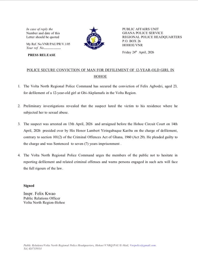 A statement issued by the Ghana Police Service (Volta North Regional Command) said the convict was arrested on April 13, 2026, following a complaint lodged with police and was arraigned the next day.