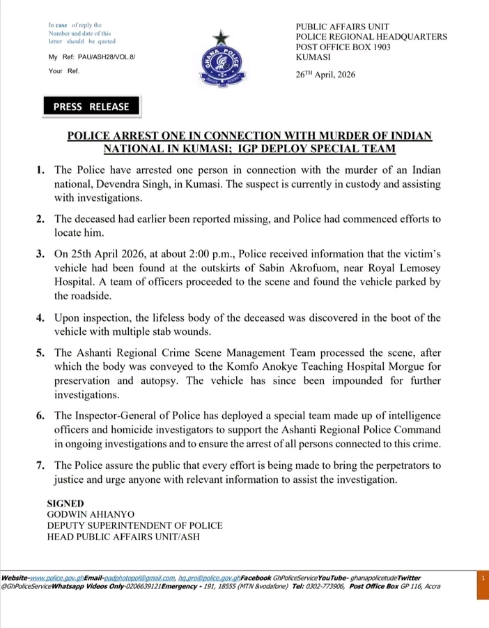 The Ghana Police Service has arrested a suspect in connection with the murder of an Indian national, Devendra Singh, in Kumasi, and deployed a special team of homicide investigators to support ongoing operations.