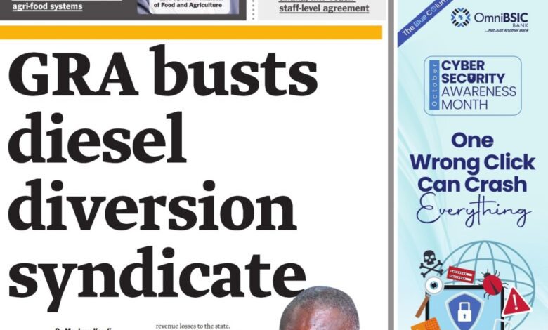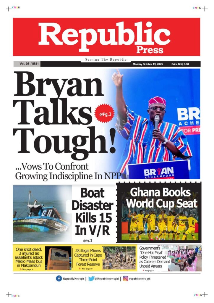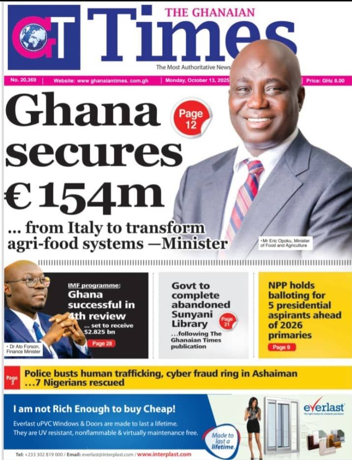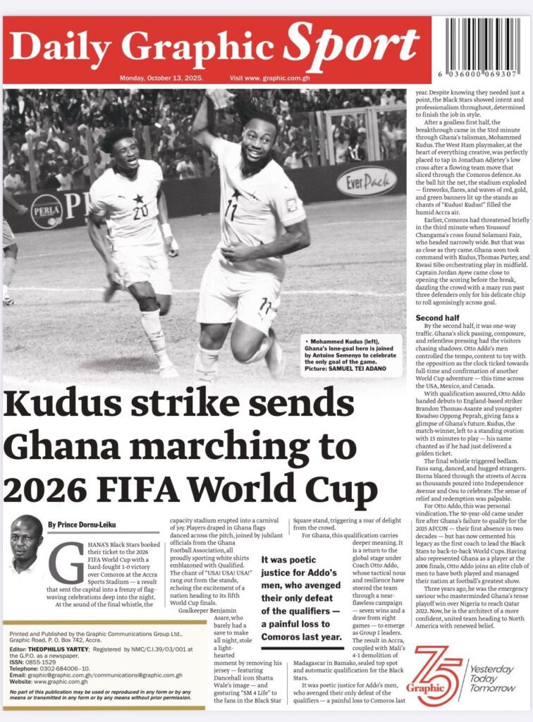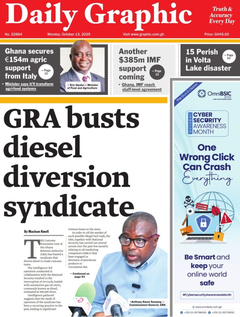 Home/General News/Newspaper Front Page: Monday, October 13, 2025 General News Newspaper Front Page: Monday, October 13, 2025 Eddie KesseOctober 13, 2025 65 Less than a minute Daily Graphic More soon… TagsFront Pages Newspaper Eddie KesseOctober 13, 2025 65 Less than a minute Share Facebook X WhatsApp Telegram