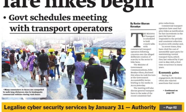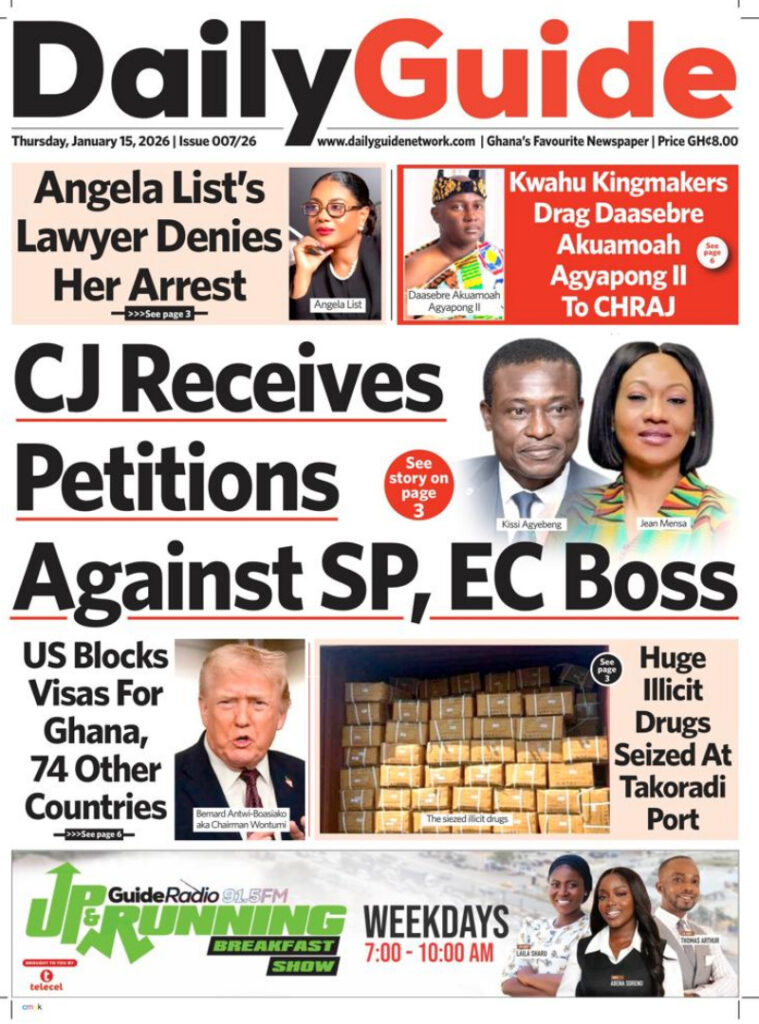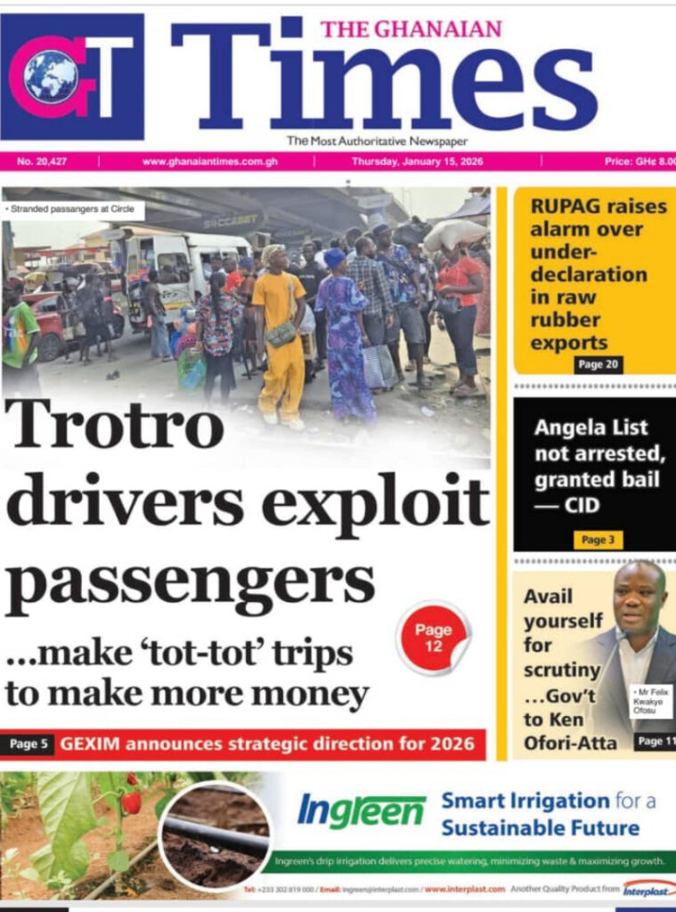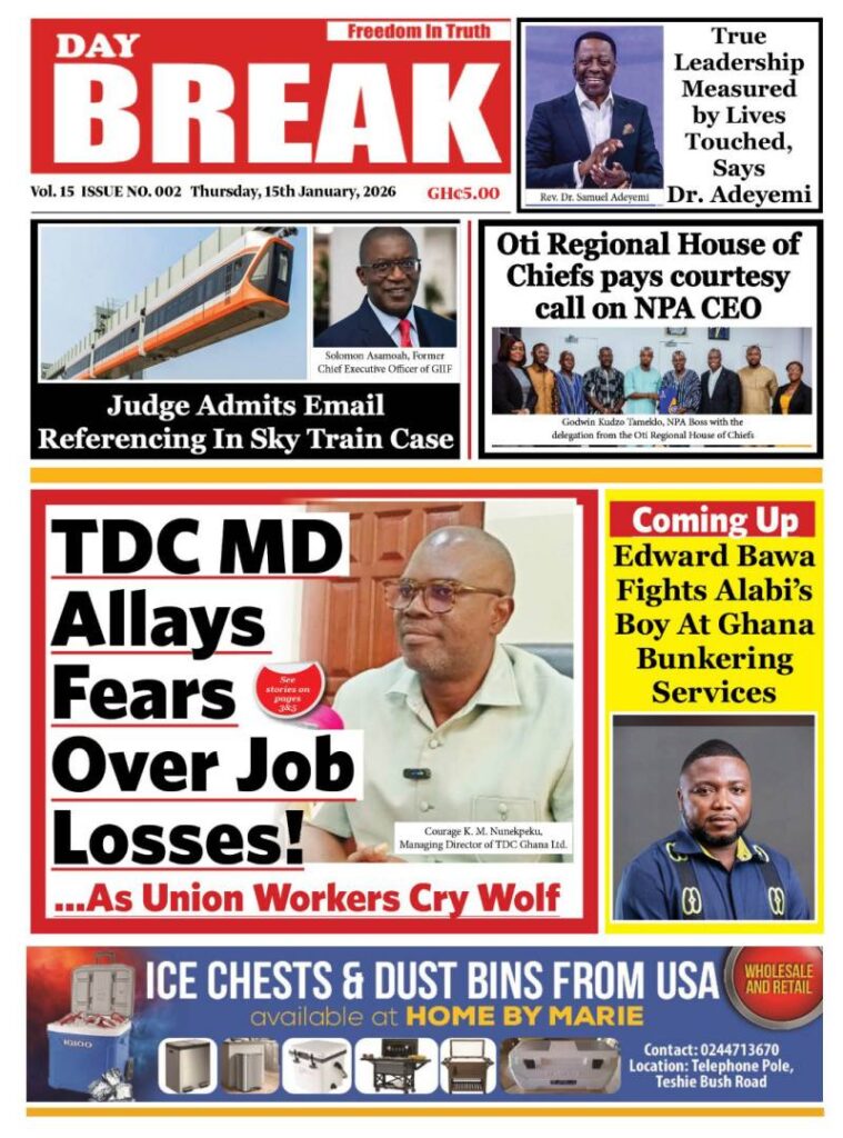 Home/General News/Newspaper Front Page: Thursday, January 15, 2026 General NewsUncategorized Newspaper Front Page: Thursday, January 15, 2026 Eddie Kesse1 week ago 117 Less than a minute Daily Graphic TagsFront Pages Newspaper Headlines Eddie Kesse1 week ago 117 Less than a minute Share Facebook X WhatsApp Telegram