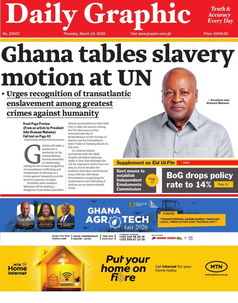 Home/General News/Newspaper Front Pages: Thursday 19th March 2026 General News Newspaper Front Pages: Thursday 19th March 2026 Eddie Kesse14 hours ago 56 Less than a minute Daily Graphic TagsFront Pages Newspaper Eddie Kesse14 hours ago 56 Less than a minute Share Facebook X WhatsApp Telegram