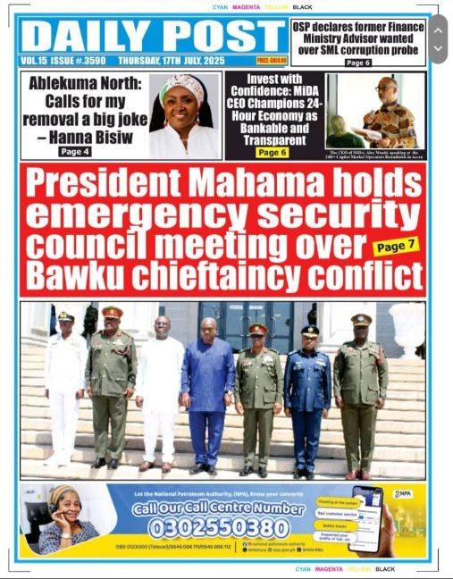 Home/General News/Newspaper Front Pages: Thursday, July 17, 2025 General News Newspaper Front Pages: Thursday, July 17, 2025 Eddie KesseJuly 17, 2025 66 Less than a minute Daily Graphic Chronicle Daily Guide Metro Lens Daily Post Graphic Showbiz TagsFront Pages Newspaper Eddie KesseJuly 17, 2025 66 Less than a minute Share Facebook X WhatsApp Telegram