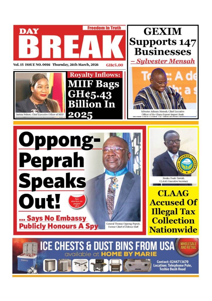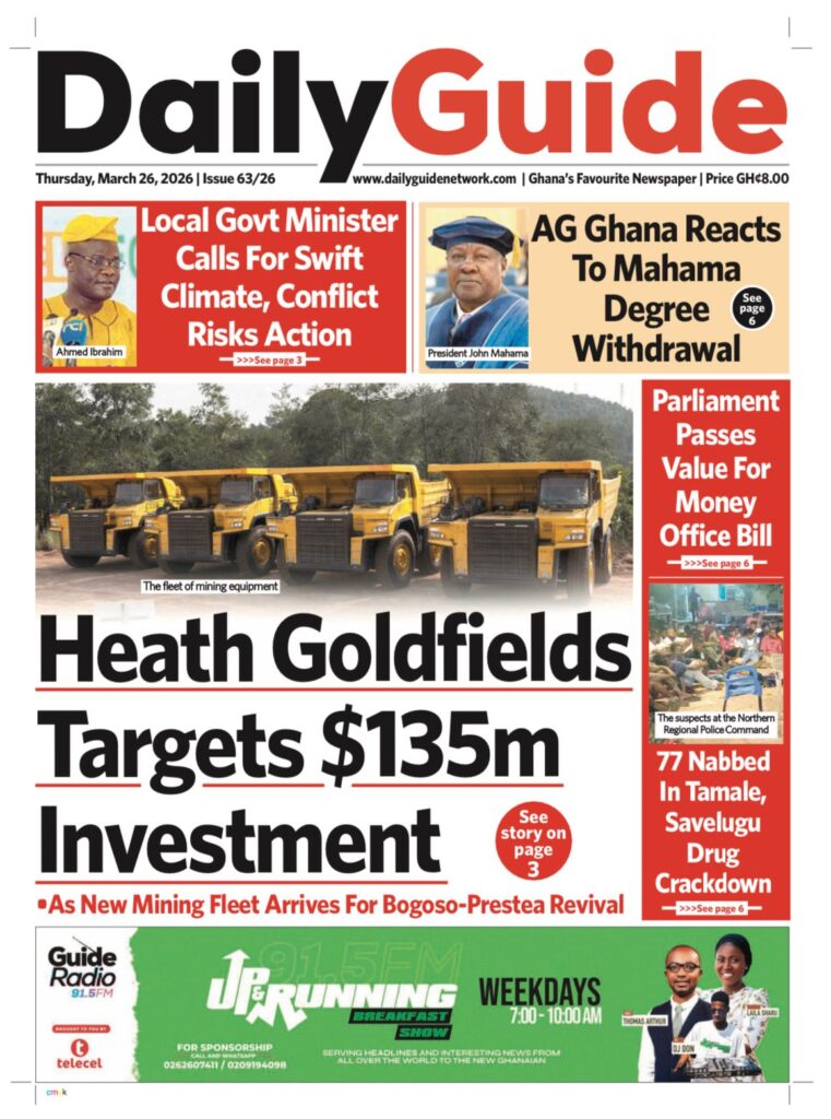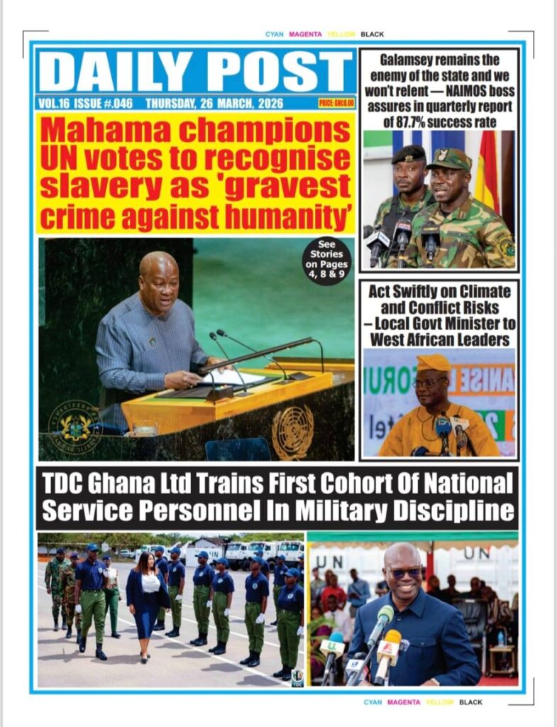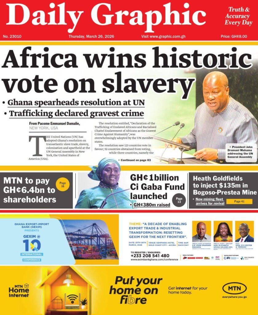 Home/General News/Newspaper Front Pages: Thursday, March 26, 2026 General News Newspaper Front Pages: Thursday, March 26, 2026 Eddie Kesse2 days ago 62 Less than a minute Daily Graphic TagsFront Pages Newspaper Eddie Kesse2 days ago 62 Less than a minute Share Facebook X WhatsApp Telegram