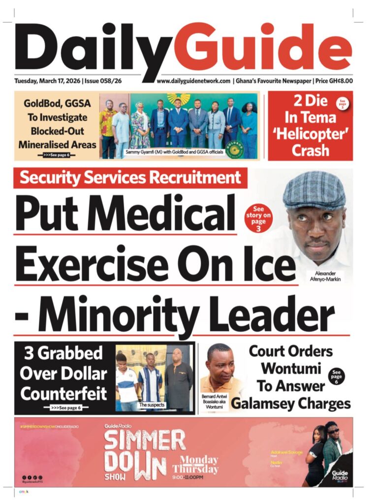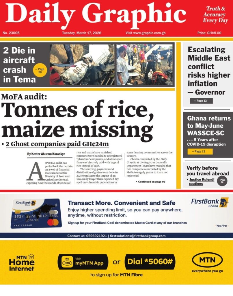Home/General News/Newspaper Front Pages: Tuesday 17th March 2026 General News Newspaper Front Pages: Tuesday 17th March 2026 Eddie Kesse4 hours ago 60 Less than a minute Daily Graphic TagsFront Pages Newspaper Eddie Kesse4 hours ago 60 Less than a minute Share Facebook X WhatsApp Telegram
