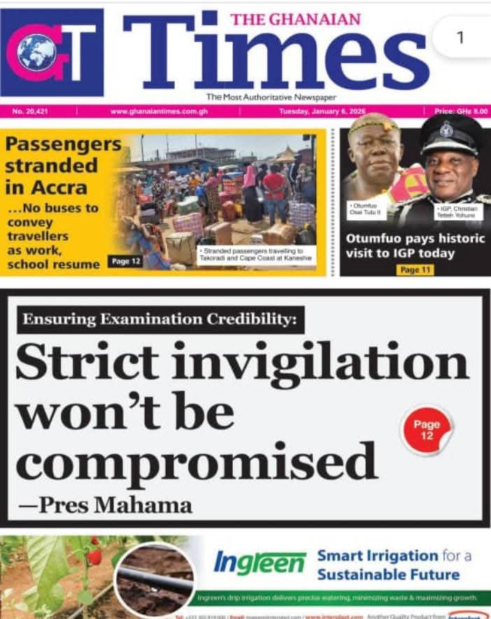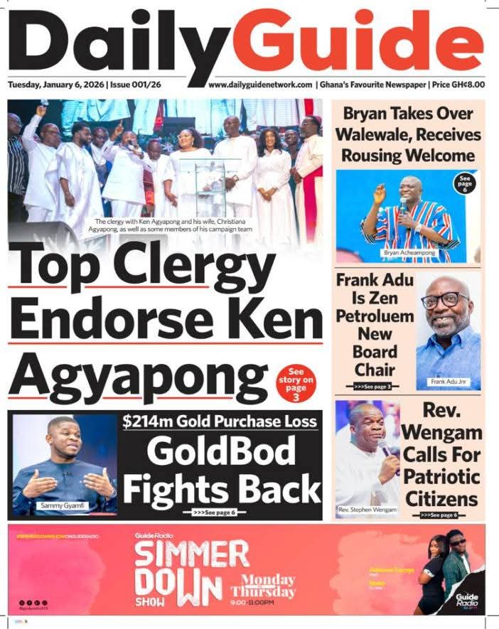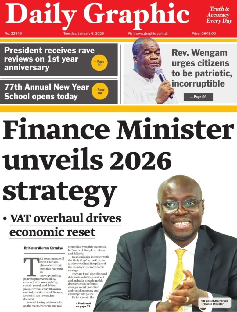Home/General News/Newspaper Front Pages: Tuesday, January 06, 2026 General News Newspaper Front Pages: Tuesday, January 06, 2026 Eddie Kesse2 days ago 86 Less than a minute Daily Graphic Daily Guide TagsFront Pages Newspaper Eddie Kesse2 days ago 86 Less than a minute Share Facebook X WhatsApp Telegram