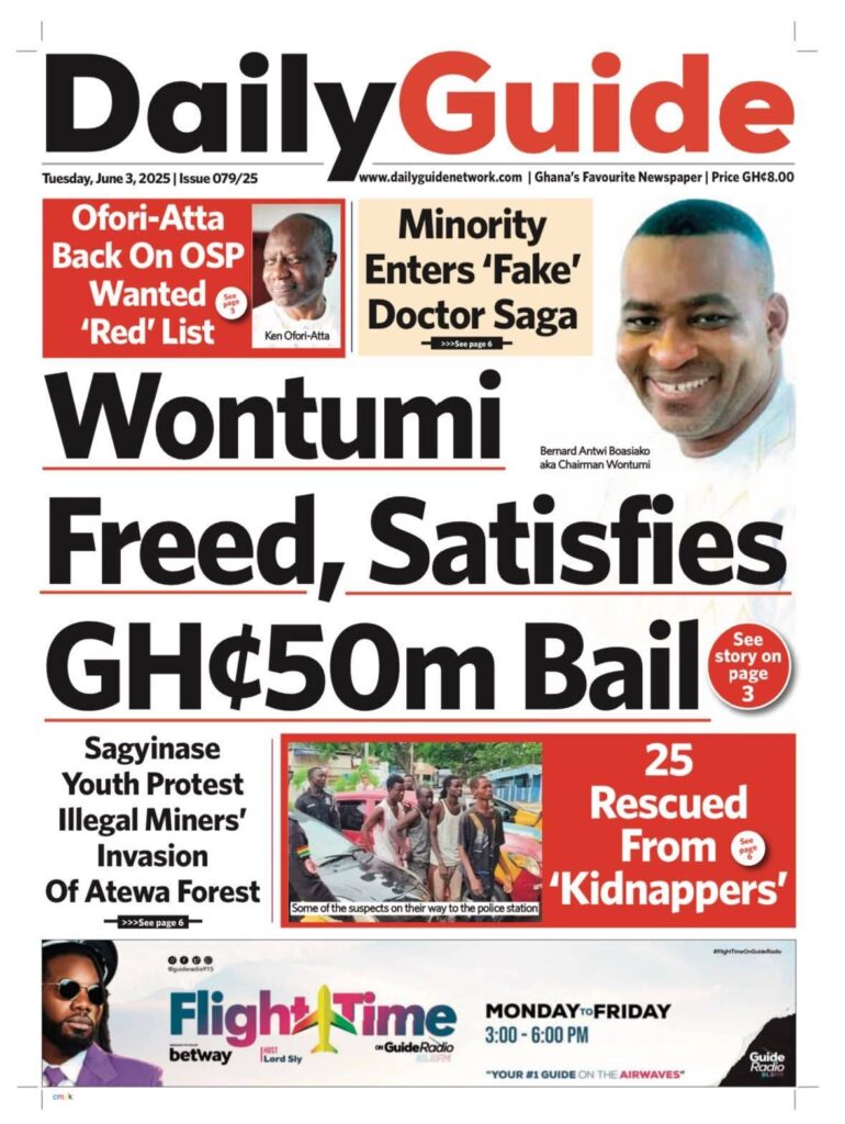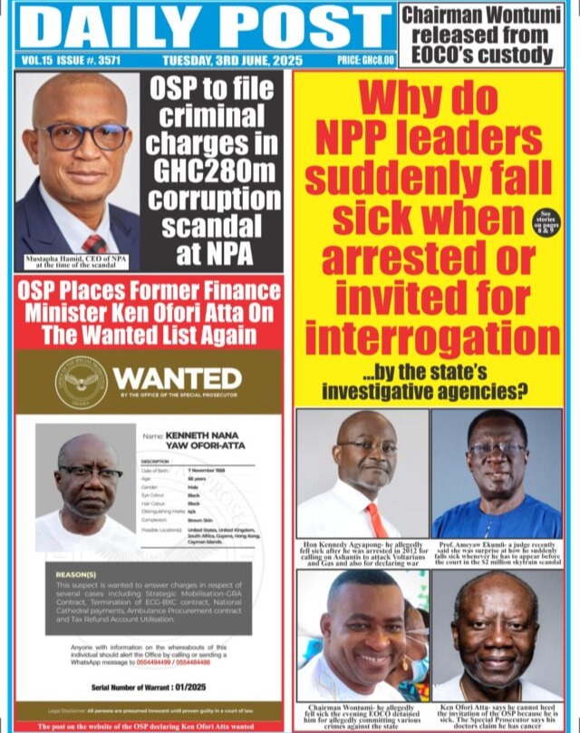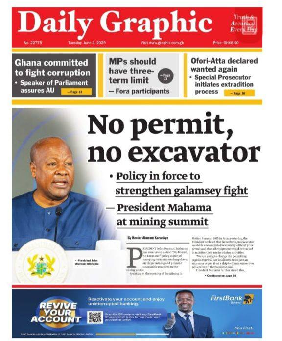 Home/General News/Newspaper Front Pages: Tuesday June 3, 2025 General News Newspaper Front Pages: Tuesday June 3, 2025 Eddie KesseJune 3, 2025 70 Less than a minute Daily Graphic The Chronicle Ghanaian Times Daily Guide TagsFront Pages Newspaper Eddie KesseJune 3, 2025 70 Less than a minute Share Facebook X WhatsApp Telegram