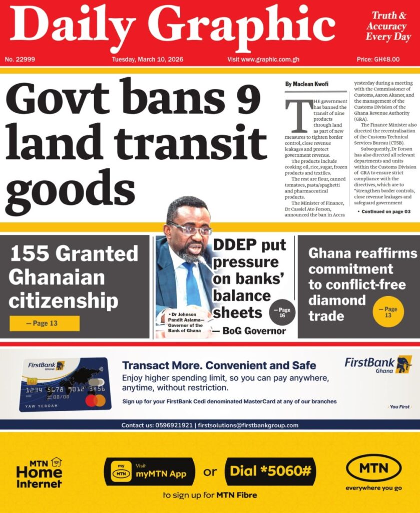 Home/General News/Newspaper Front Pages: Tuesday, March 10, 2026 General News Newspaper Front Pages: Tuesday, March 10, 2026 Eddie Kesse1 hour ago 41 Less than a minute Daily Graphic TagsFront Pages Newspaper Eddie Kesse1 hour ago 41 Less than a minute Share Facebook X WhatsApp Telegram