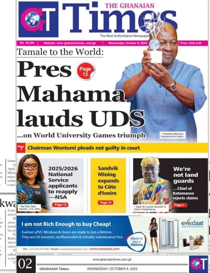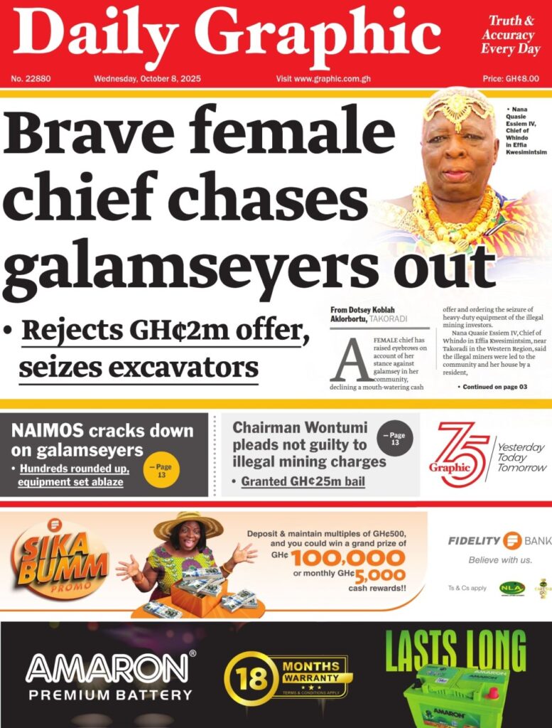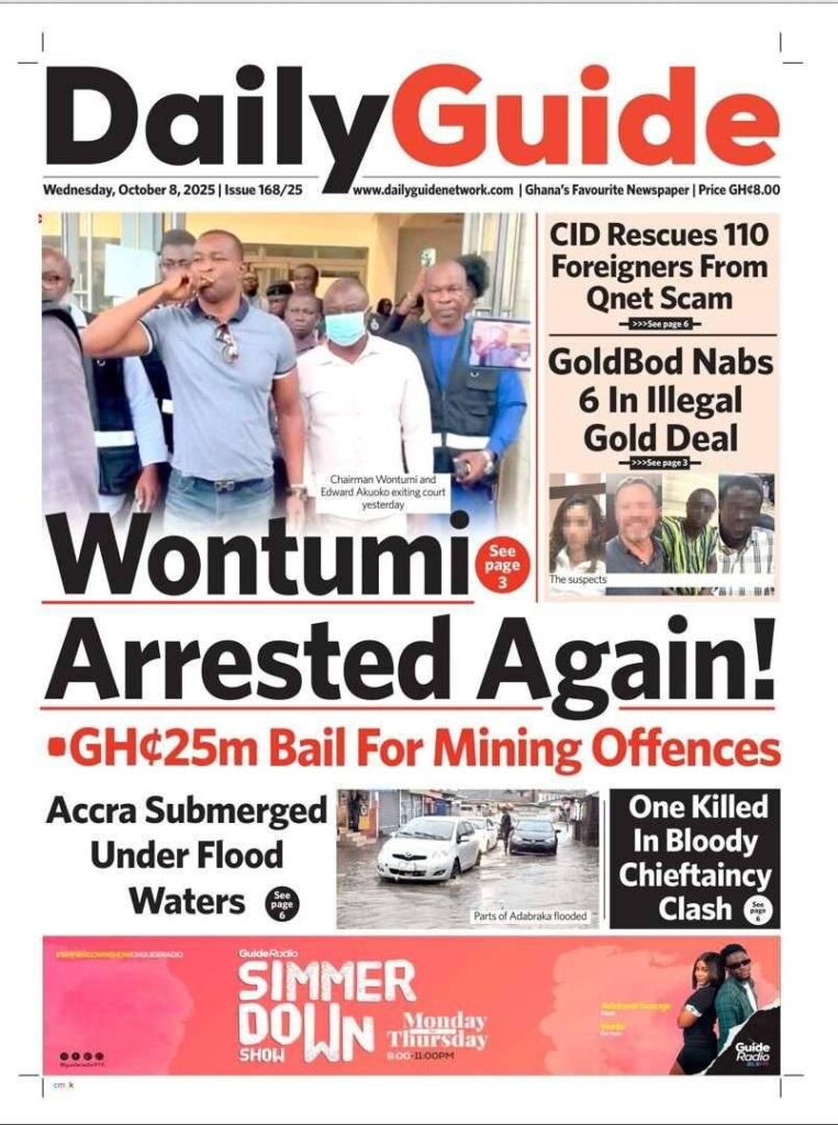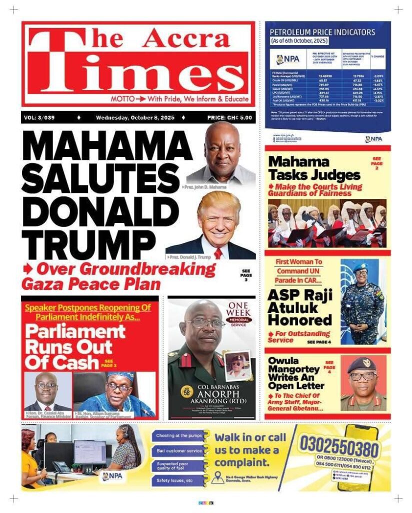 Home/General News/Newspaper Front Pages Wednesday, October 08, 2025 General News Newspaper Front Pages Wednesday, October 08, 2025 Eddie KesseOctober 8, 2025 176 Less than a minute Daily Graphic TagsFront Pages Newspaper Eddie KesseOctober 8, 2025 176 Less than a minute Share Facebook X WhatsApp Telegram