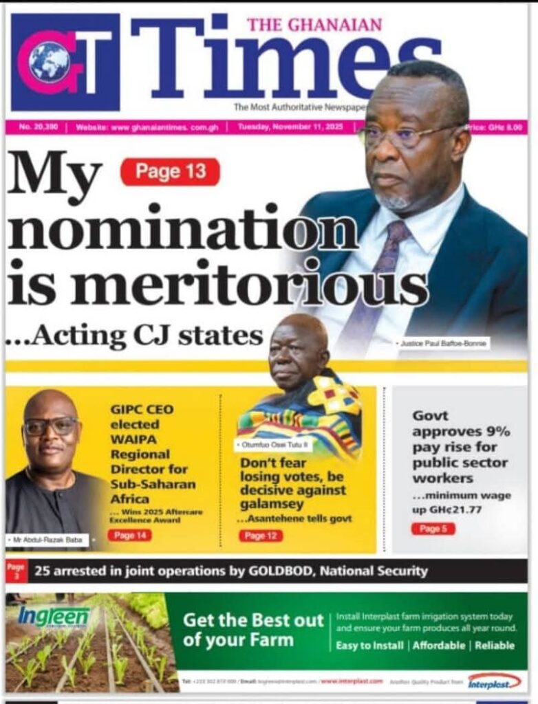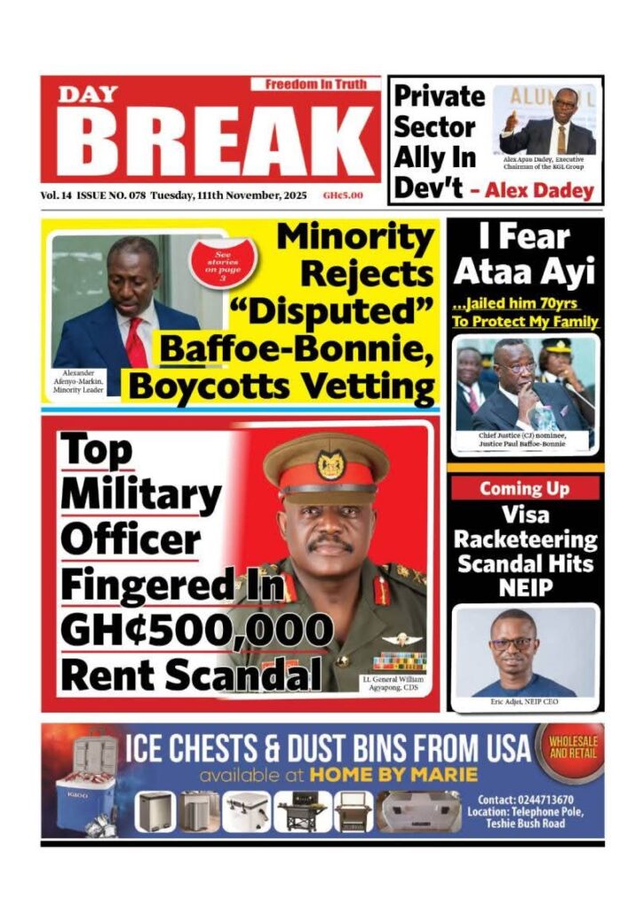 Home/General News/Tuesday November 11 2025 Newspaper Headlines General News Tuesday November 11 2025 Newspaper Headlines Eddie Kesse3 weeks ago 110 Less than a minute Daily Graphic TagsFront Pages Newspaper Eddie Kesse3 weeks ago 110 Less than a minute Share Facebook X WhatsApp Telegram